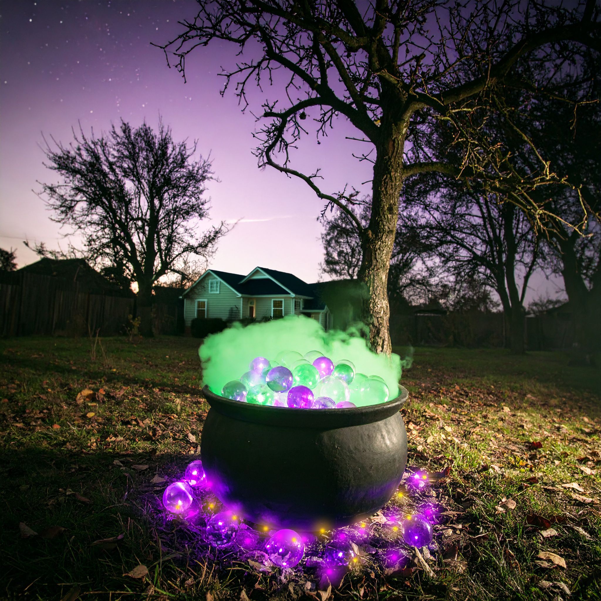 Fog + lights = instant witch’s brew. Drop a light set into a cauldron with dry ice or a fog machine, then toss in clear ornaments for bubbly “potions.” Kids will lose their minds over this one.